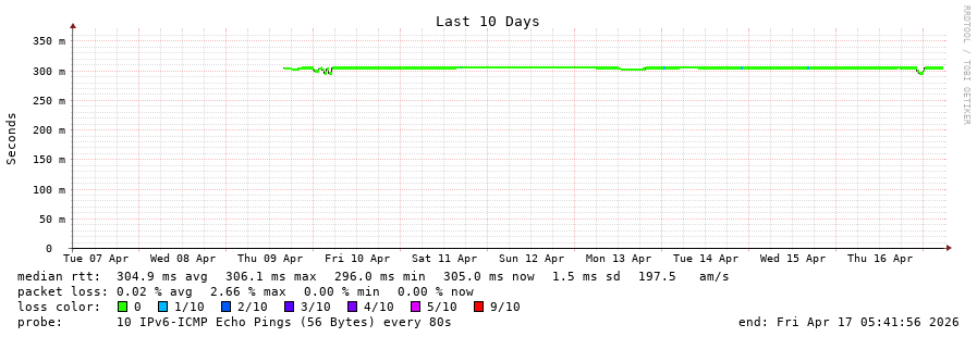 traceroute to 2402:1f00:8400::2:0:19c (2402:1f00:8400::2:0:19c), 30 hops max, 80 byte packets - Generated at 2026-04-17 02:30:01