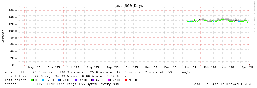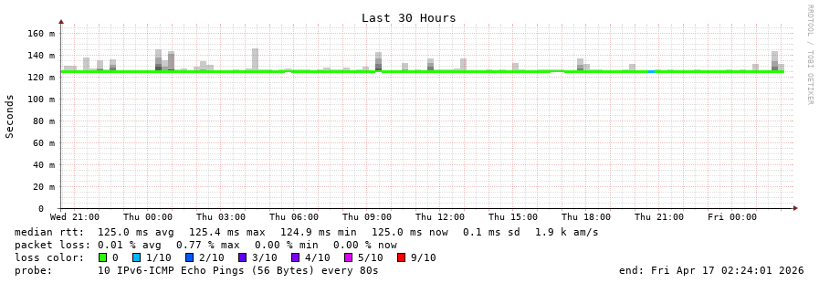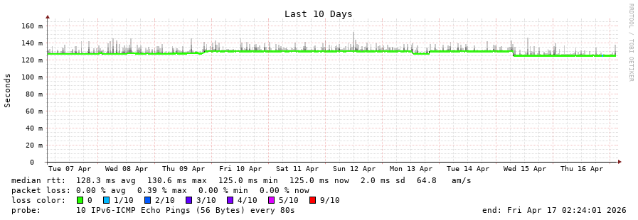 traceroute to 2602:feda:b8e:10::1 (2602:feda:b8e:10::1), 30 hops max, 80 byte packets - Generated at 2026-04-16 19:45:01